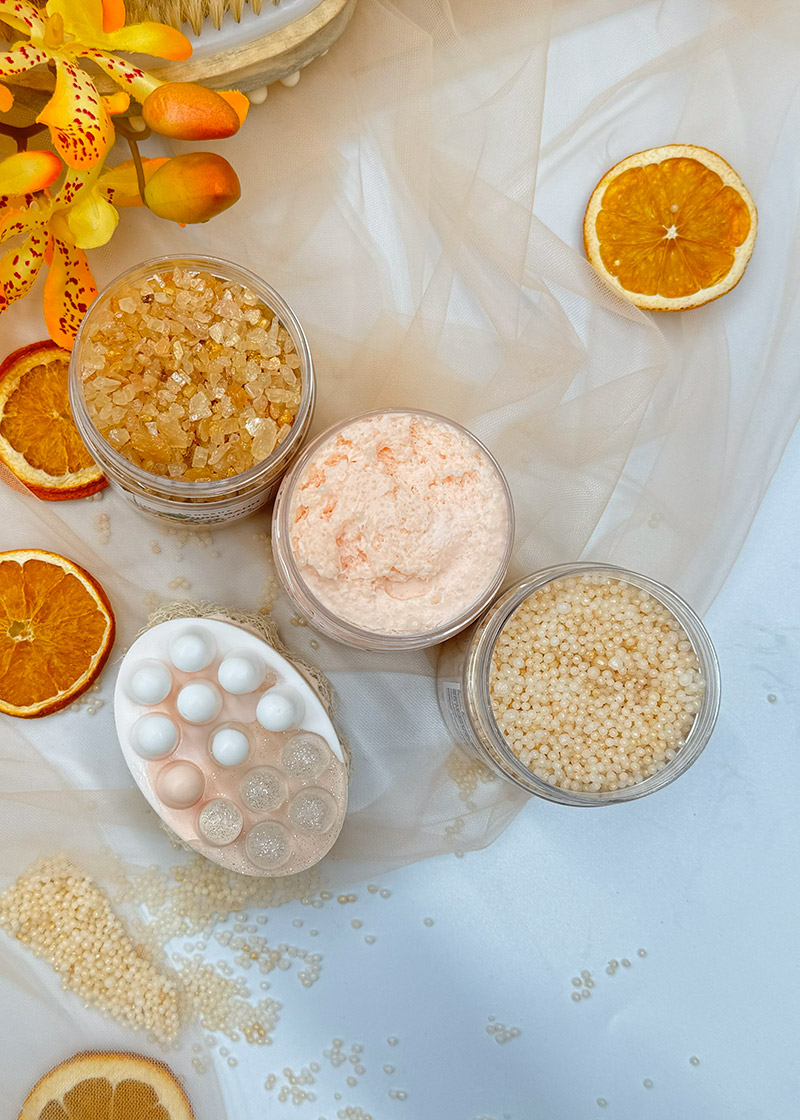 SPA-набор с ароматом exotic fruits: скраб на кокосовом масле, мерцающая соль, увлажняющий бисер и массажное мыло с люфой. Дарит коже питание, свежесть и яркое фруктовое настроение.